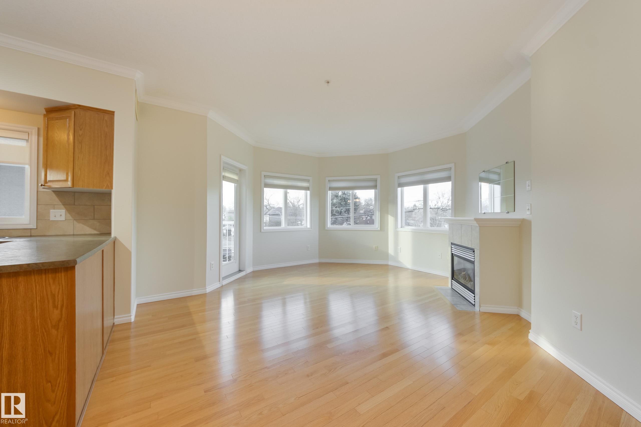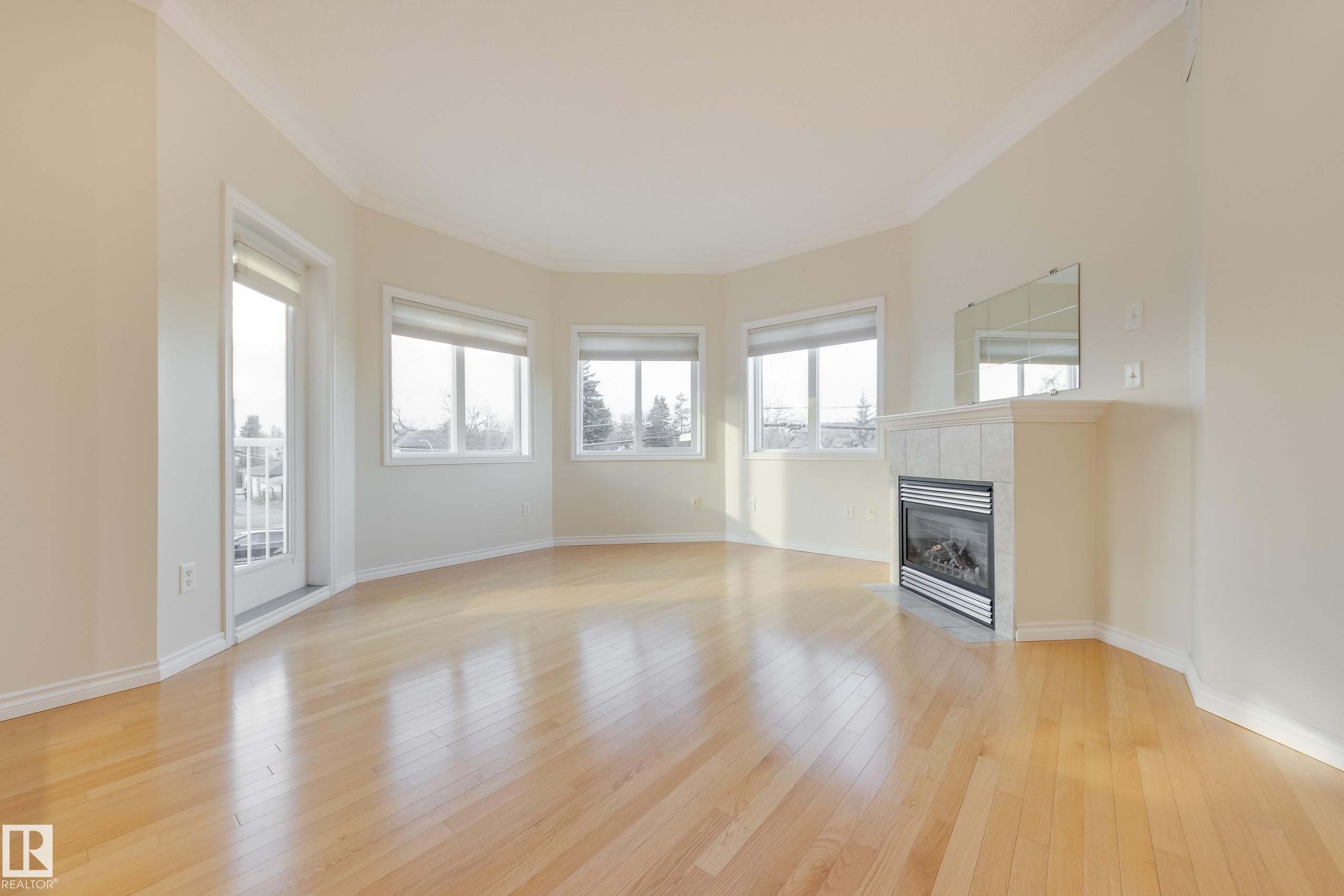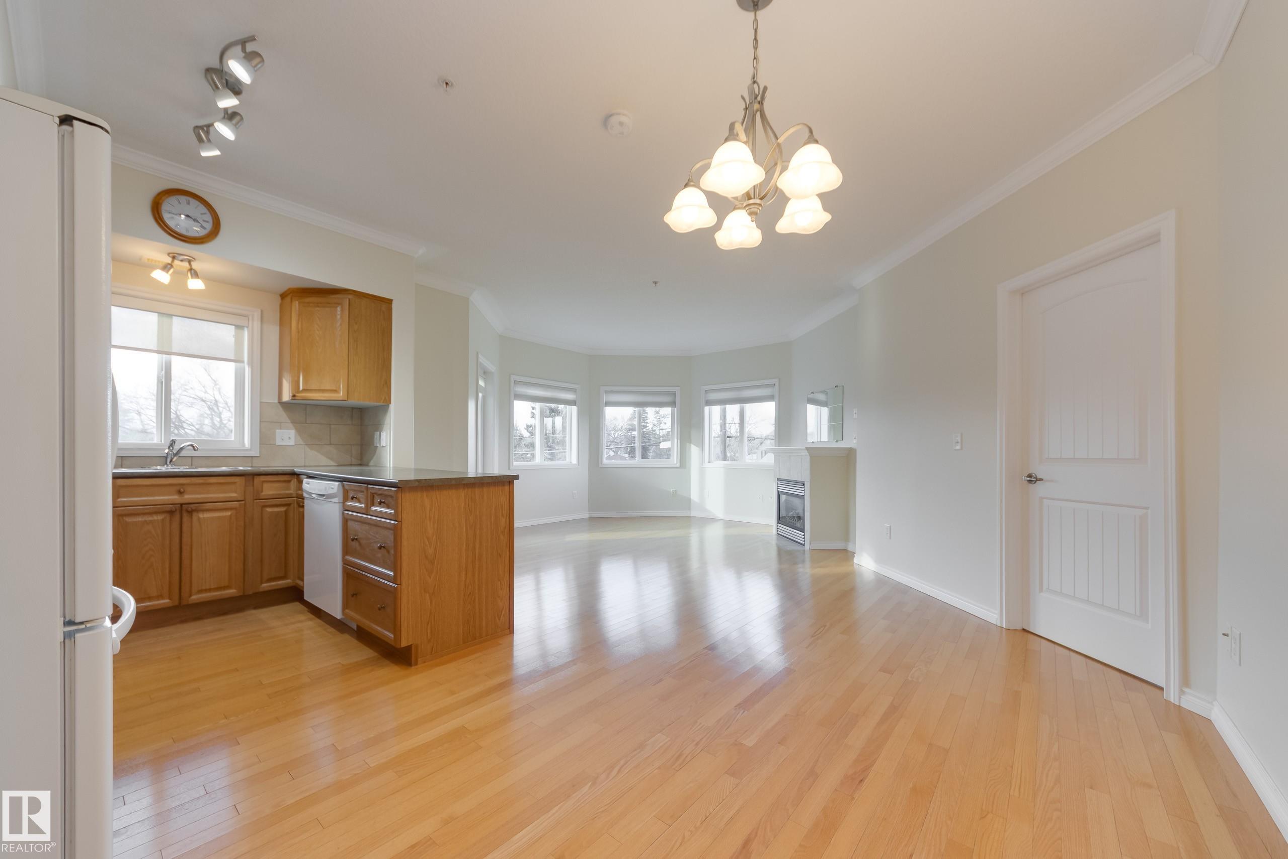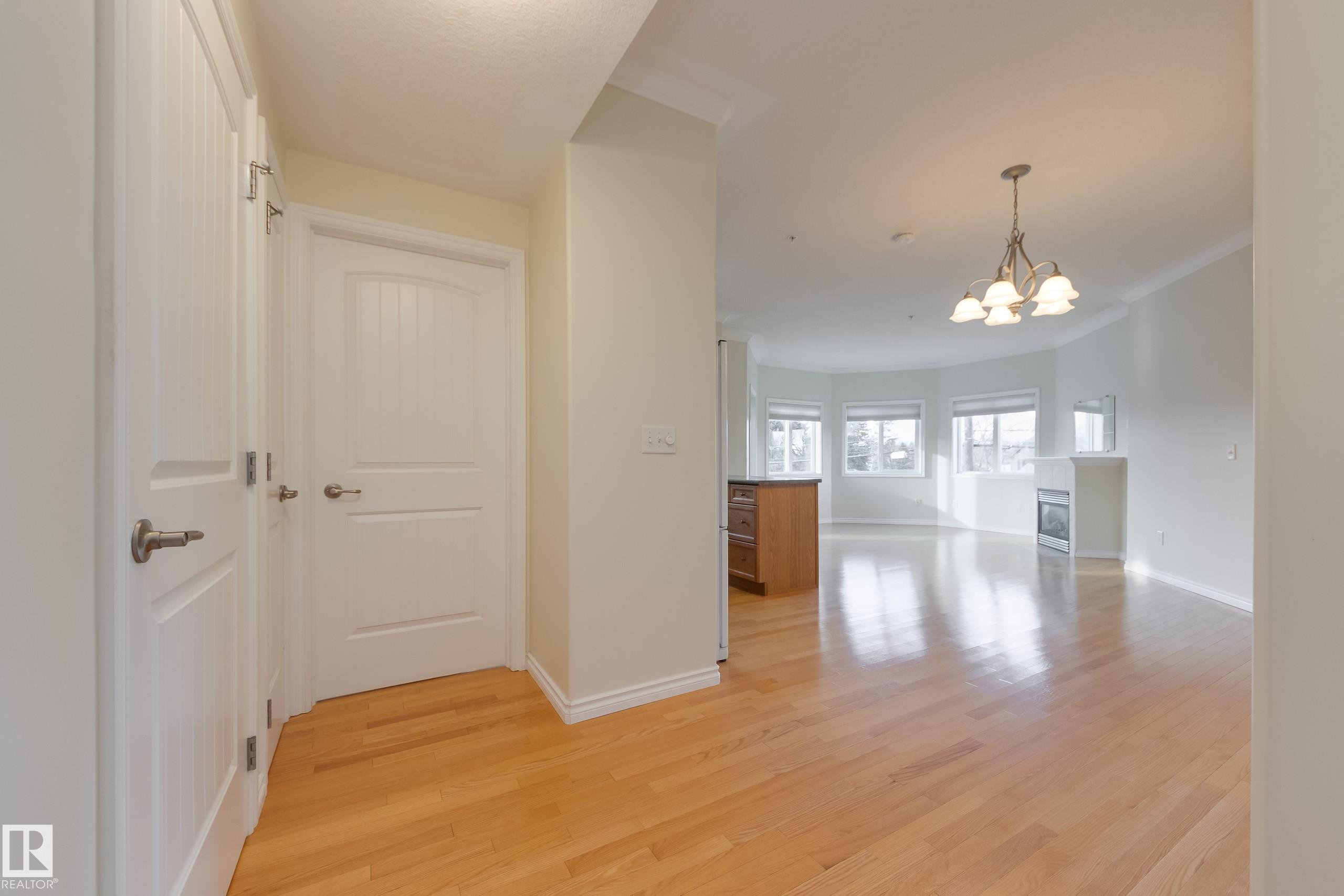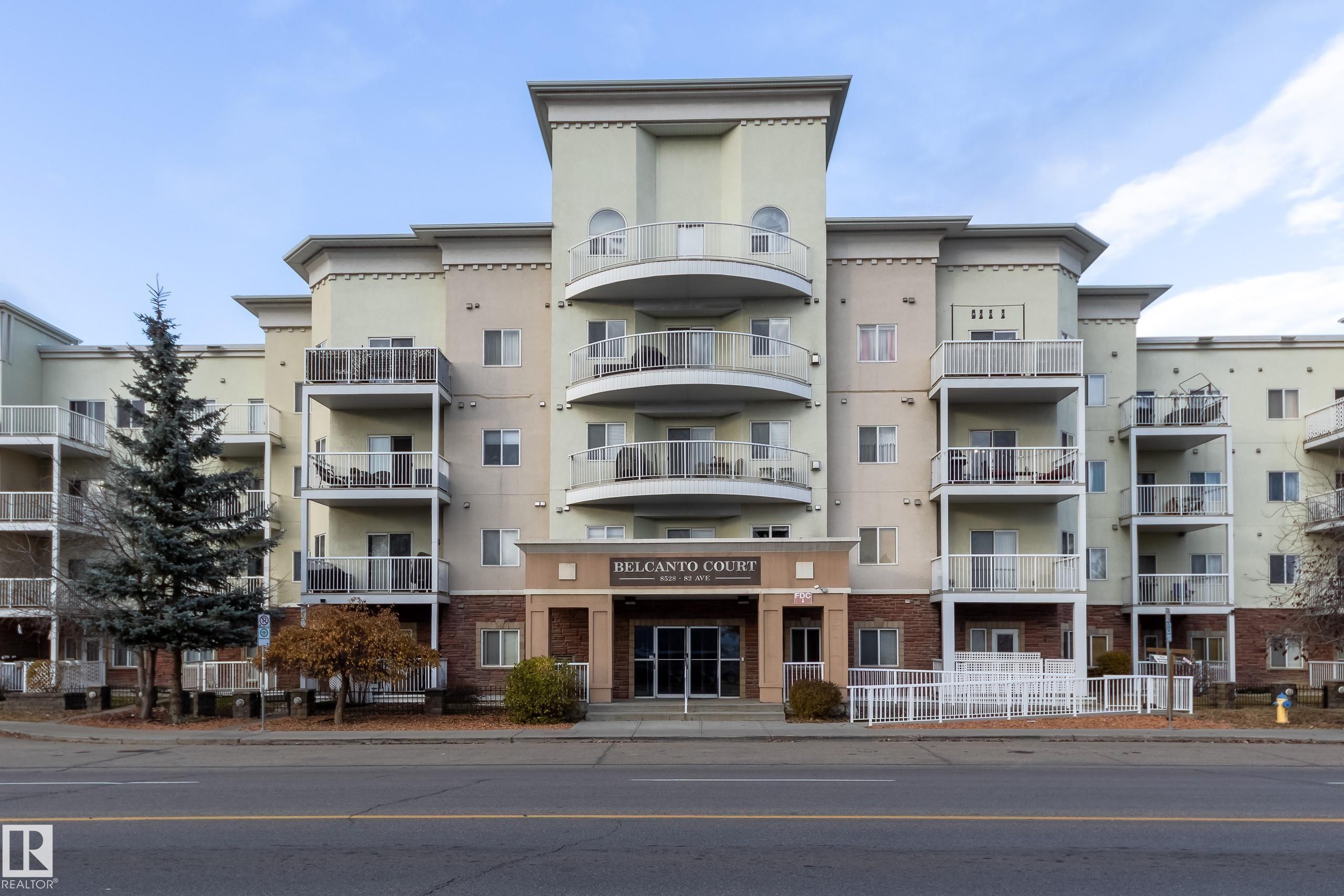 CORNER END UNIT! This gem has 2 beds, 2 baths, AIR CONDITIONING, 9-ft ceilings, GLEAMING HARDWOOD & upgrades throughout. Extremely well maintained by original owners. Freshly painted; move-in ready! The kitchen and living spaces are open concept. Loads of windows, natural light, and a cozy gas fireplace. The large west-facing balcony is your outdoor oasis and features a natural gas hook-up for the BBQ. The ultra-quiet & spacious primary suite has a walk-through closet that leads to your well equipped 3-pc ensuite bath. Another bed & bath are on the other side of the unit; minimal sound transfer! IN-SUITE LAUNDRY (machines less than 2 yrs old) and ample storage. You also have an assigned UNDERGROUND PARKING STALL to keep your vehicle warm all winter, along with a storage cage for your seasonal items. Belcanto Court is a 45+ building that has a real sense of community and fantastic amenities including a car wash in the heated parkade, a social room, and a guest suite. Bonnie Doon Mall & transit steps away!