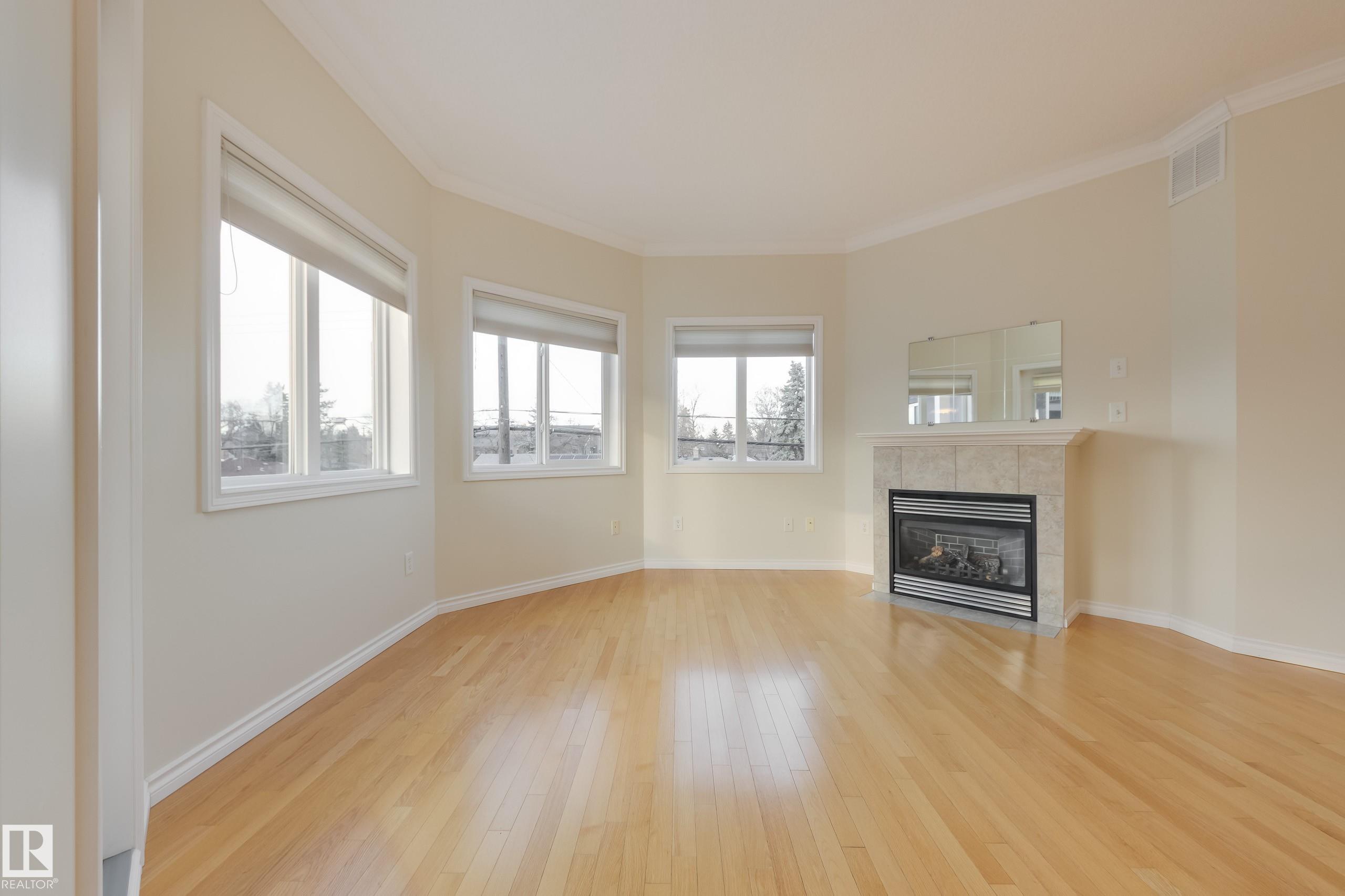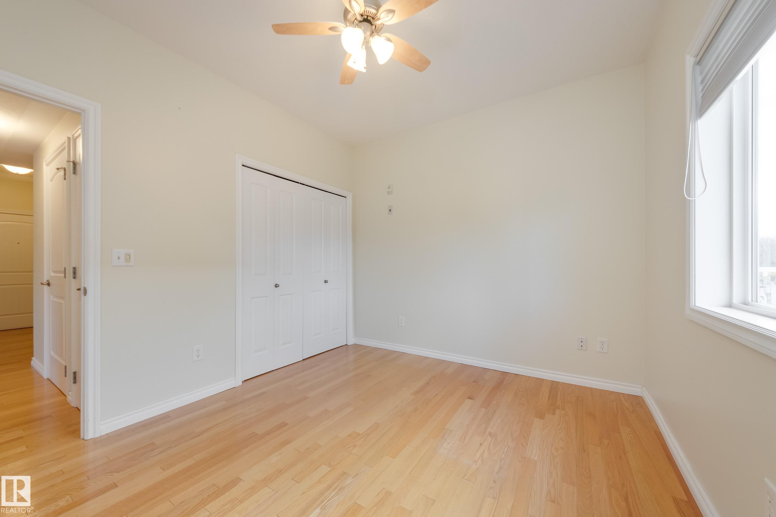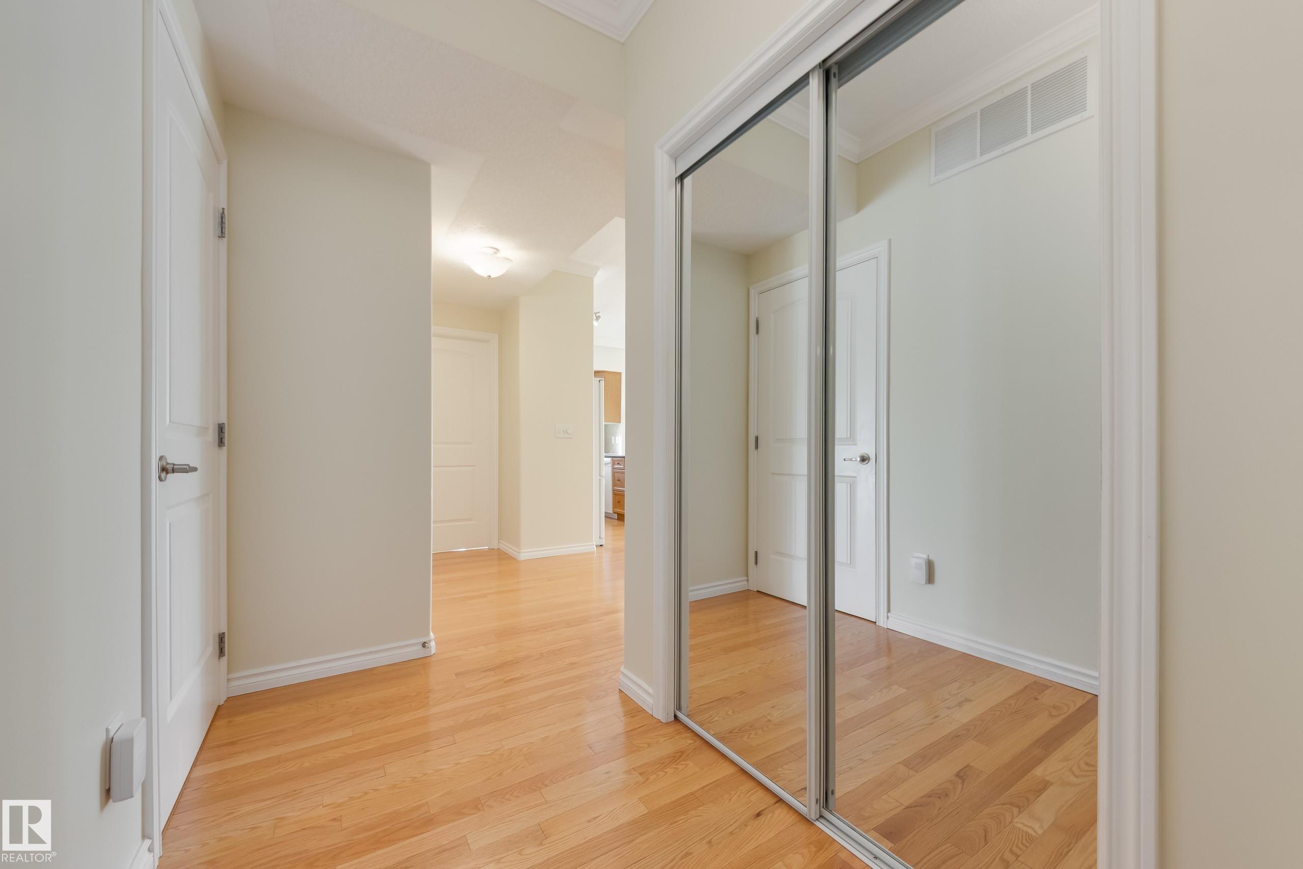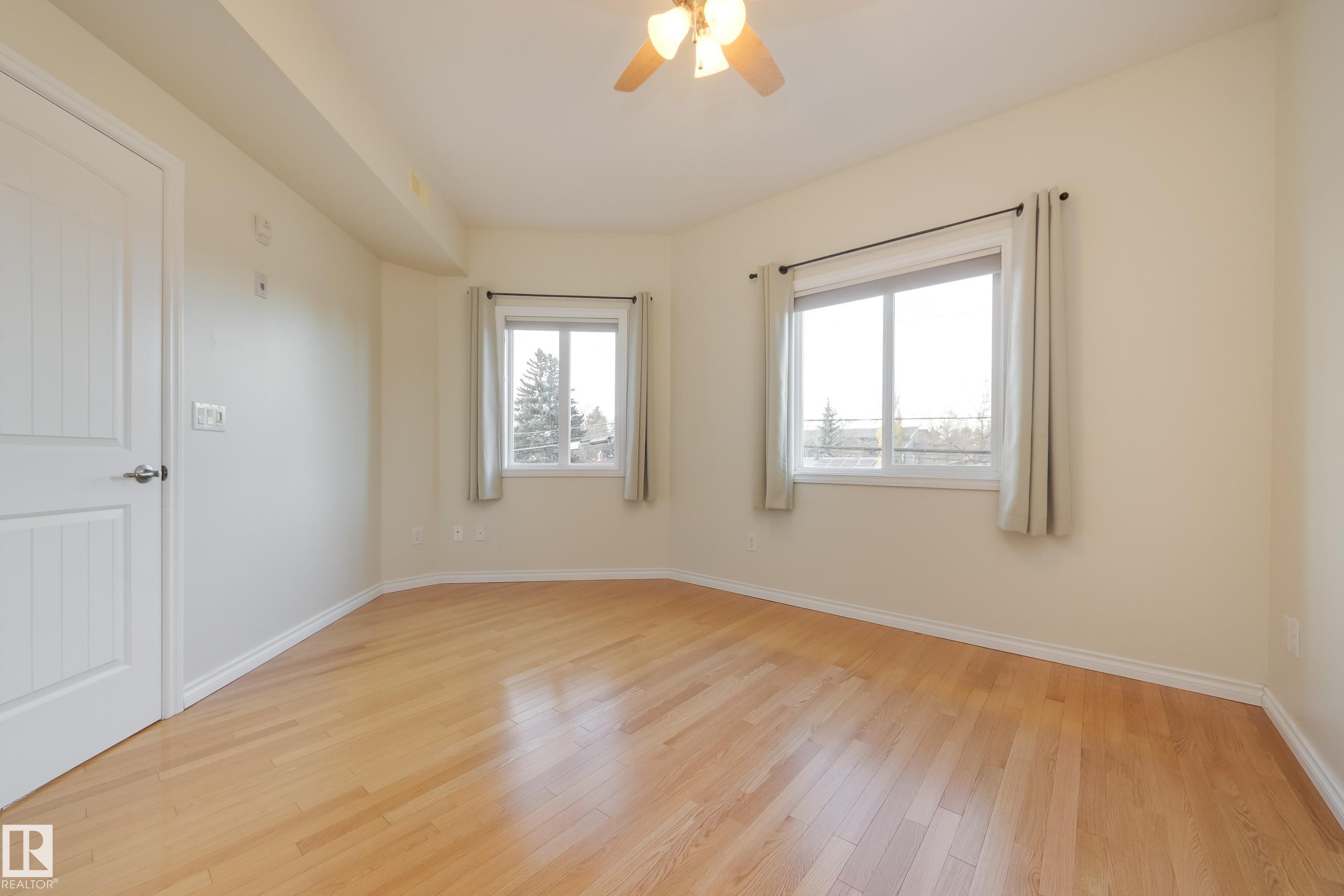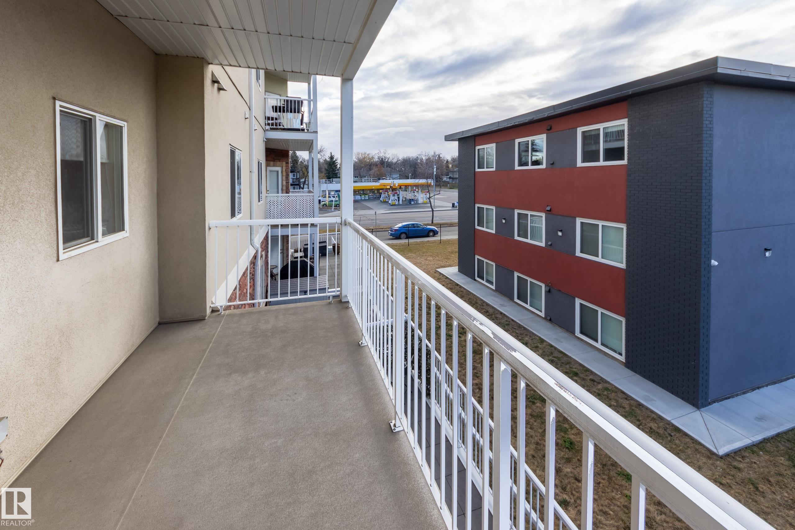 CORNER END UNIT! This gem has 2 beds, 2 baths, AIR CONDITIONING, 9-ft ceilings, GLEAMING HARDWOOD & upgrades throughout. Extremely well maintained by original owners. Freshly painted; move-in ready! The kitchen and living spaces are open concept. Loads of windows, natural light, and a cozy gas fireplace. The large west-facing balcony is your outdoor oasis and features a natural gas hook-up for the BBQ. The ultra-quiet & spacious primary suite has a walk-through closet that leads to your well equipped 3-pc ensuite bath. Another bed & bath are on the other side of the unit; minimal sound transfer! IN-SUITE LAUNDRY (machines less than 2 yrs old) and ample storage. You also have an assigned UNDERGROUND PARKING STALL to keep your vehicle warm all winter, along with a storage cage for your seasonal items. Belcanto Court is a 45+ building that has a real sense of community and fantastic amenities including a car wash in the heated parkade, a social room, and a guest suite. Bonnie Doon Mall & transit steps away!