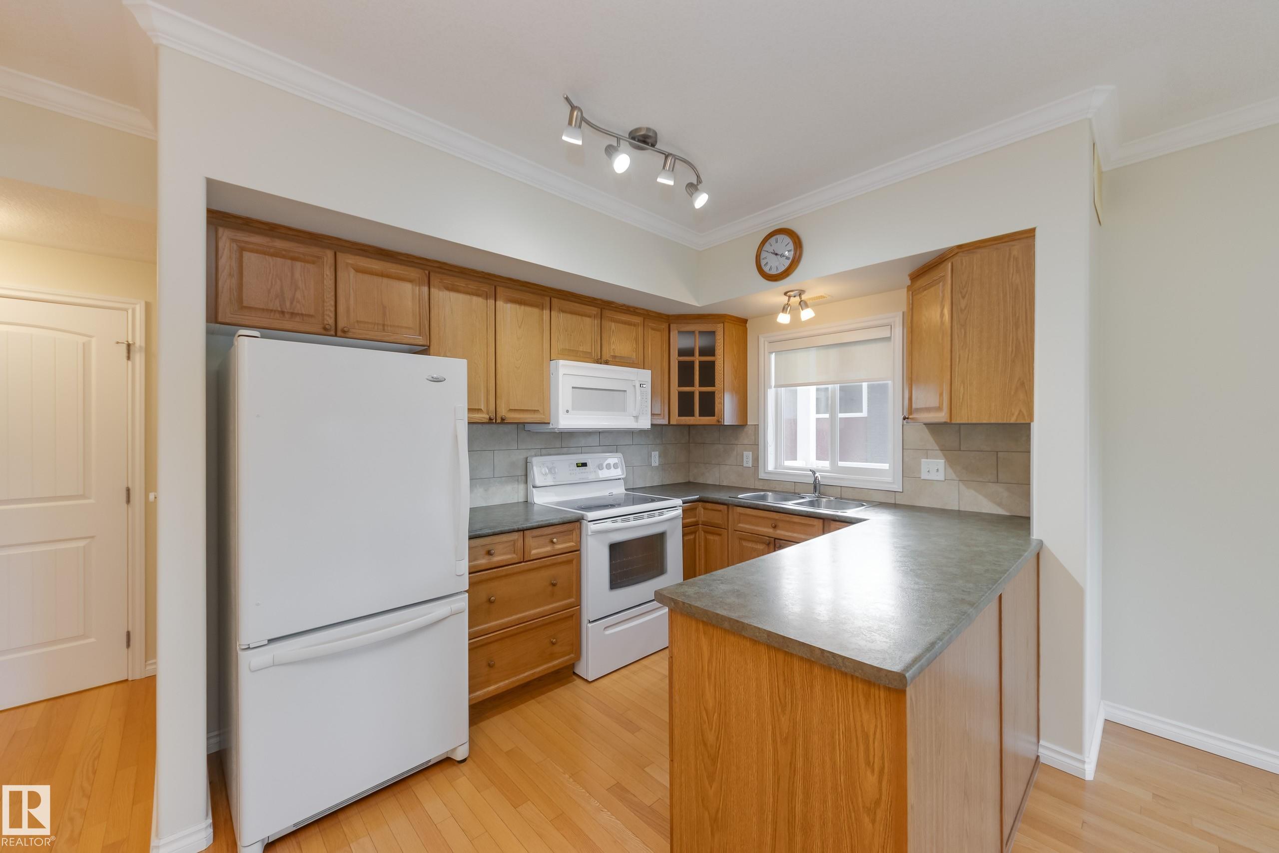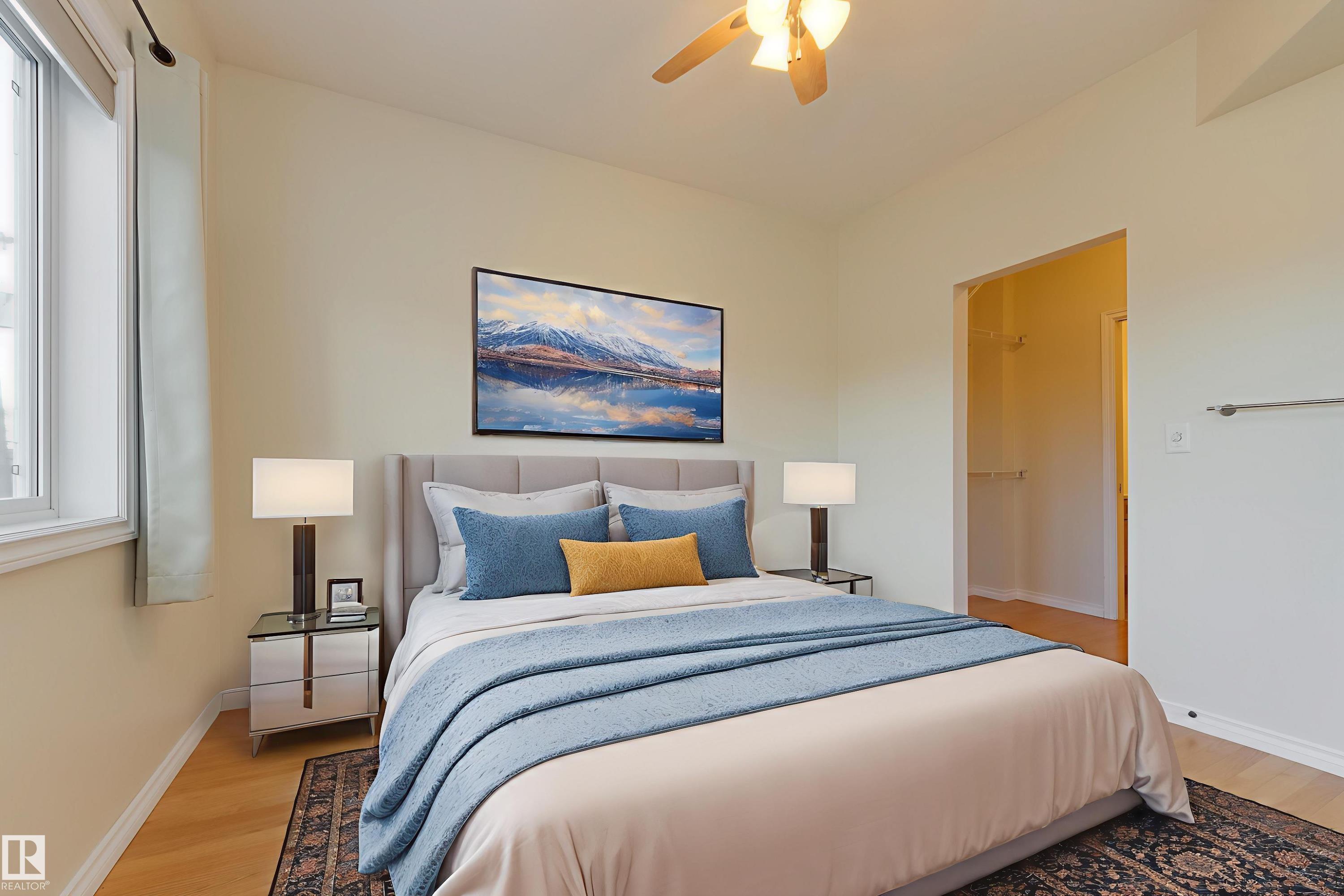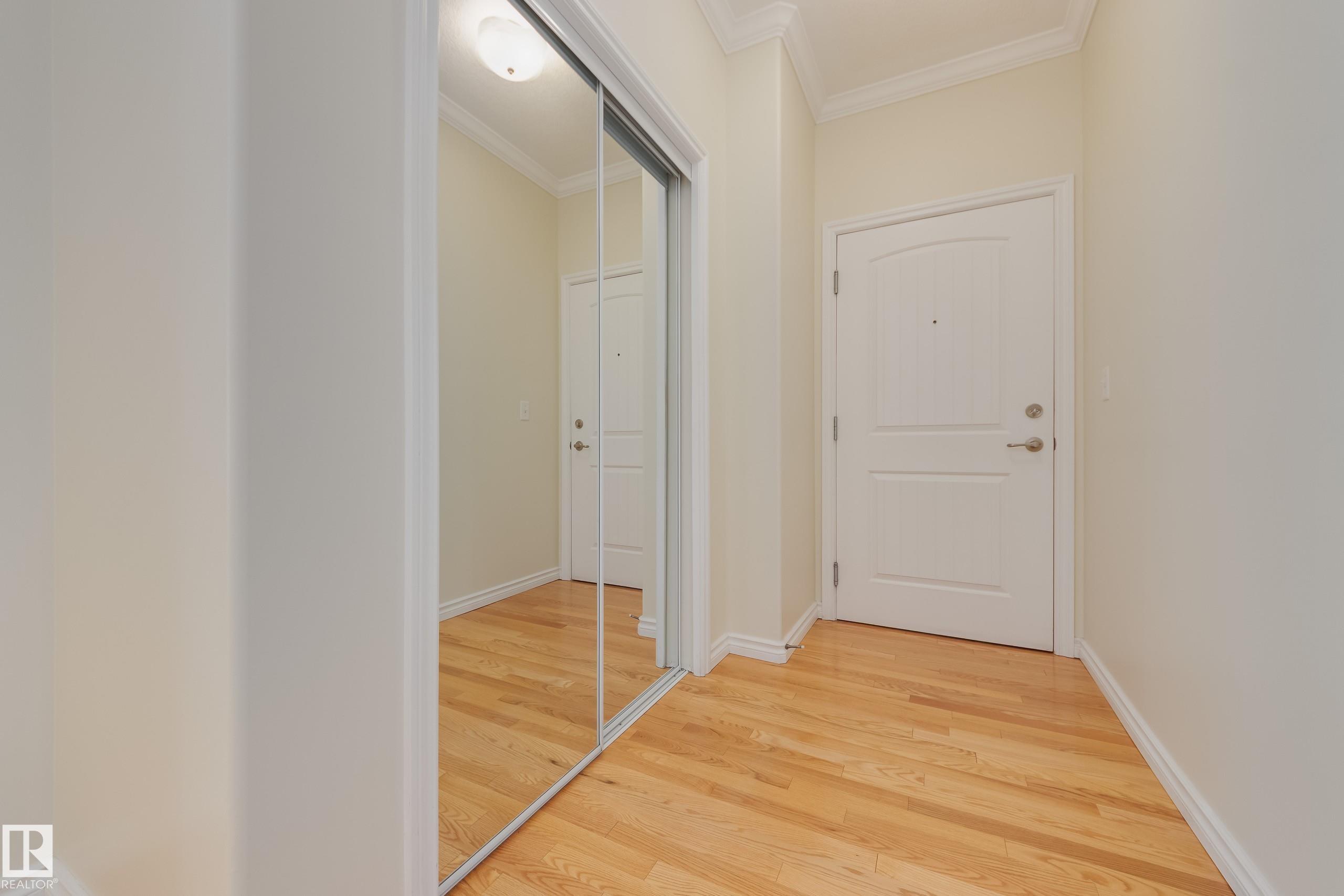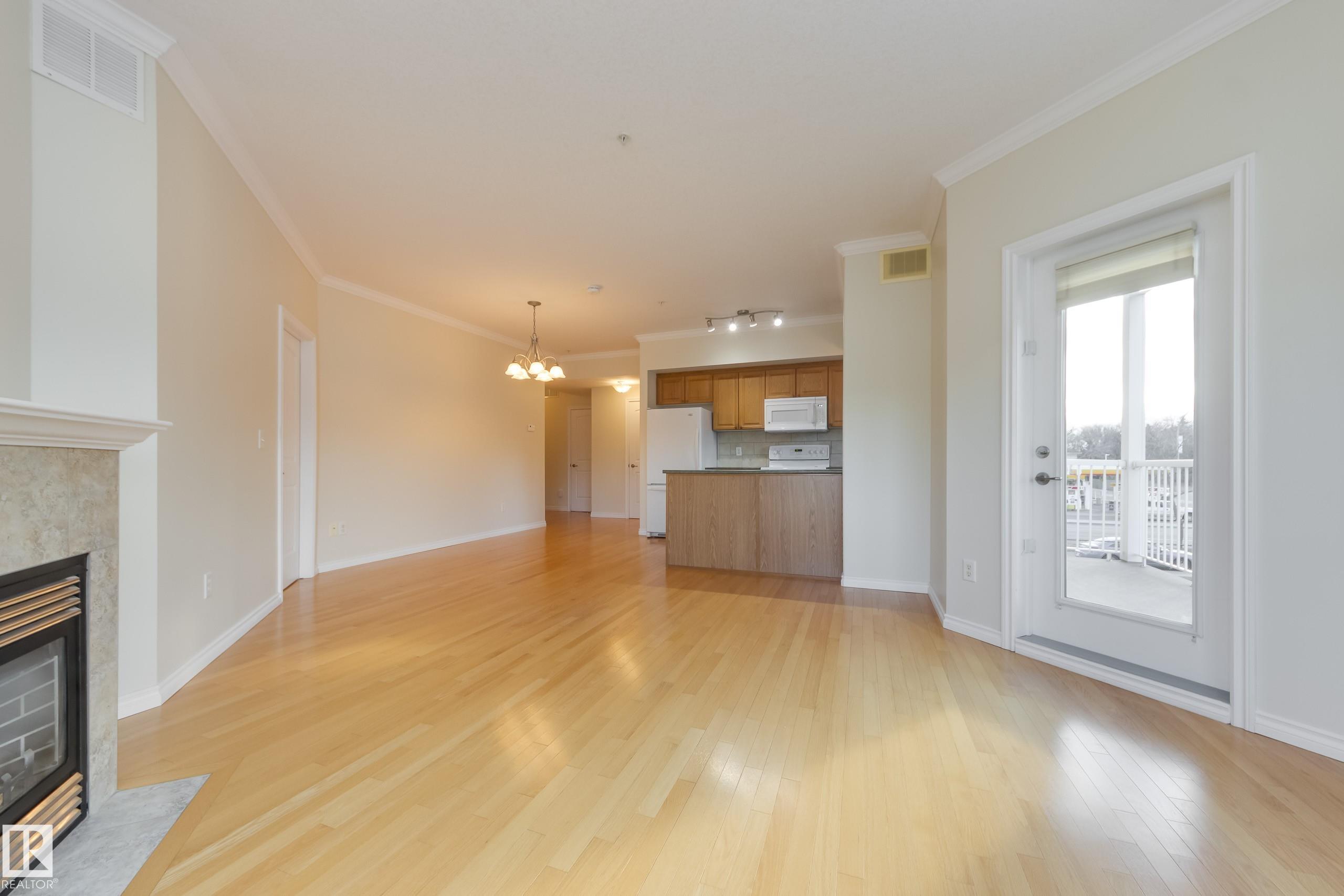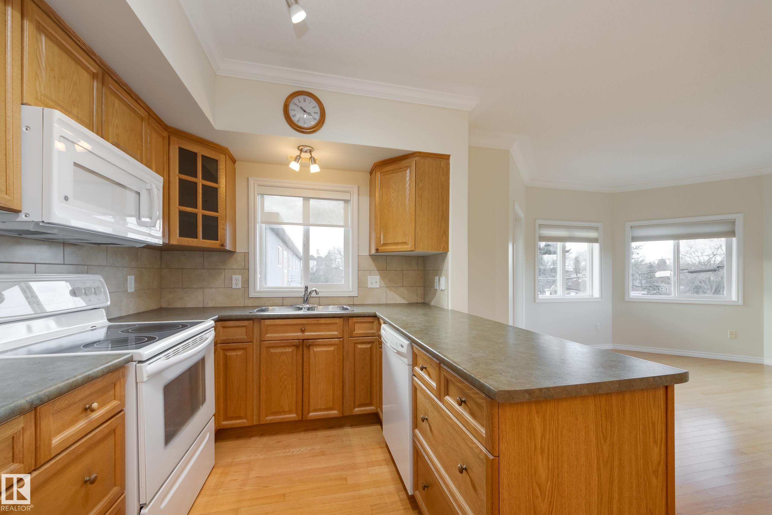 CORNER END UNIT! This gem has 2 beds, 2 baths, AIR CONDITIONING, 9-ft ceilings, GLEAMING HARDWOOD & upgrades throughout. Extremely well maintained by original owners. Freshly painted; move-in ready! The kitchen and living spaces are open concept. Loads of windows, natural light, and a cozy gas fireplace. The large west-facing balcony is your outdoor oasis and features a natural gas hook-up for the BBQ. The ultra-quiet & spacious primary suite has a walk-through closet that leads to your well equipped 3-pc ensuite bath. Another bed & bath are on the other side of the unit; minimal sound transfer! IN-SUITE LAUNDRY (machines less than 2 yrs old) and ample storage. You also have an assigned UNDERGROUND PARKING STALL to keep your vehicle warm all winter, along with a storage cage for your seasonal items. Belcanto Court is a 45+ building that has a real sense of community and fantastic amenities including a car wash in the heated parkade, a social room, and a guest suite. Bonnie Doon Mall & transit steps away!