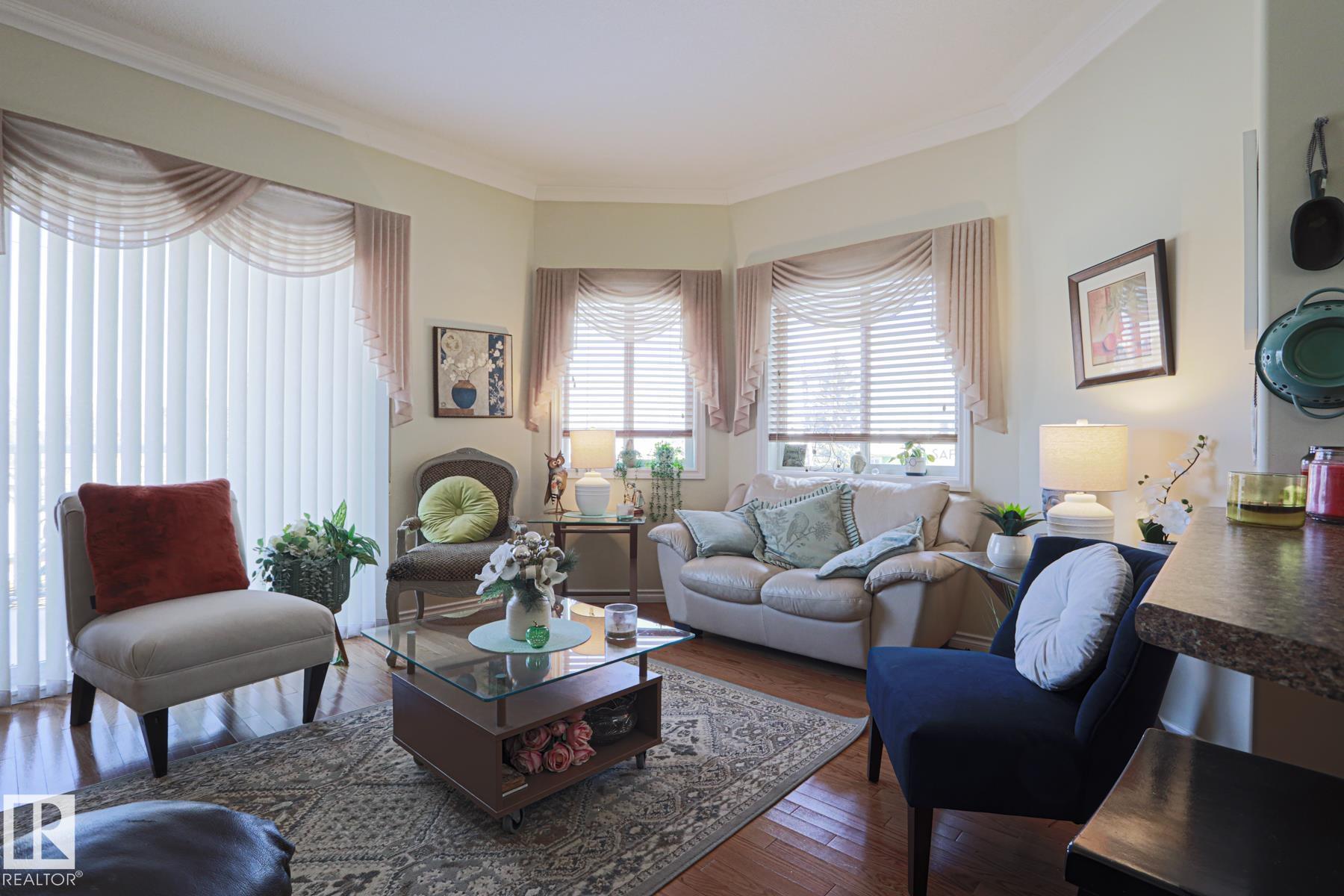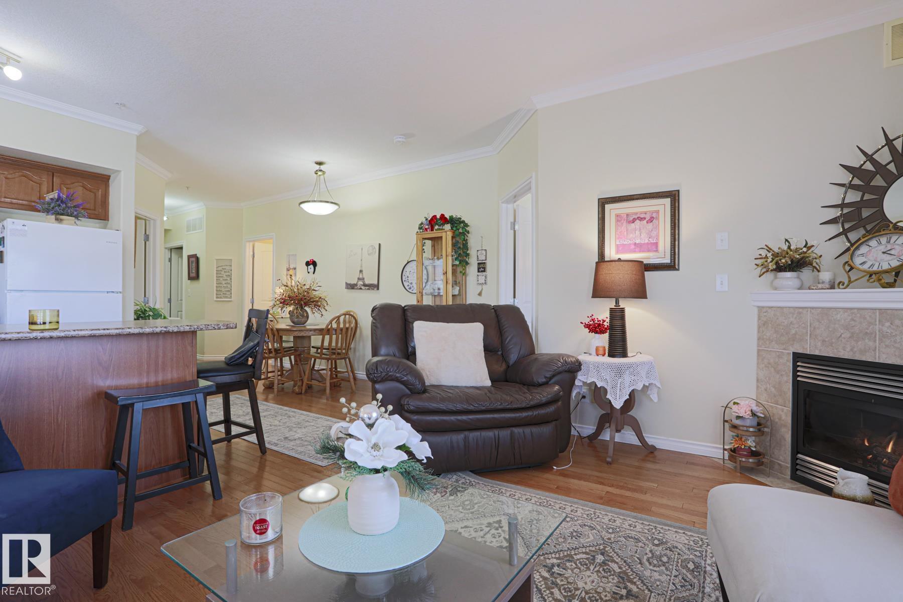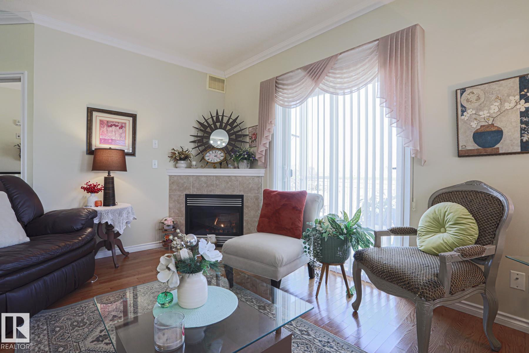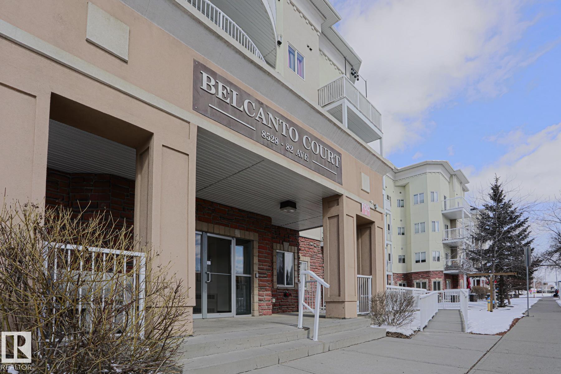 Adult living at its best in Belcanto Court in desirable Bonnie Doon. Beautiful 3rd floor north and east facing suite has lovely primary bedroom, walk through closet and three piece ensuite. Gorgeous hardwood floor adorns the living room with 9' ceilings which features a heartwarming natural gas fireplace with mantle to display your favorite photos and art. Bright kitchen with oak cabinets has a step saving wrap-around style that makes meal prep easy and convenient to serve the breakfast bar and smart dinette. A huge den (which can technically be a bedroom as it has a sprinkler head) makes for a great guest room, office, hobby/craft or relaxing private TV/reading room. You decide! Nice four piece bath for guests with tub. Large laundry room with stacker washer/dryer, lots of shelving and space for your collectibles too. Underground heated parking, carwash, guest suite and social room for savings, value and comfort. Bonnie Doon Mall + Valley Line LRT is close-by for your shopping and travelling convenience.