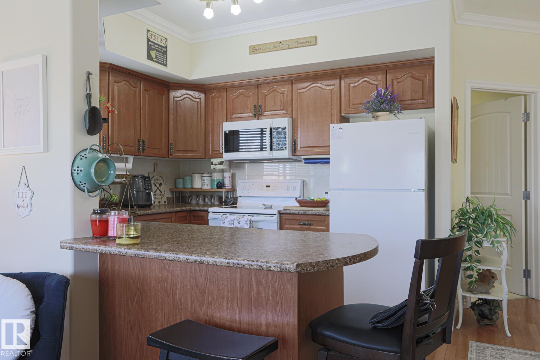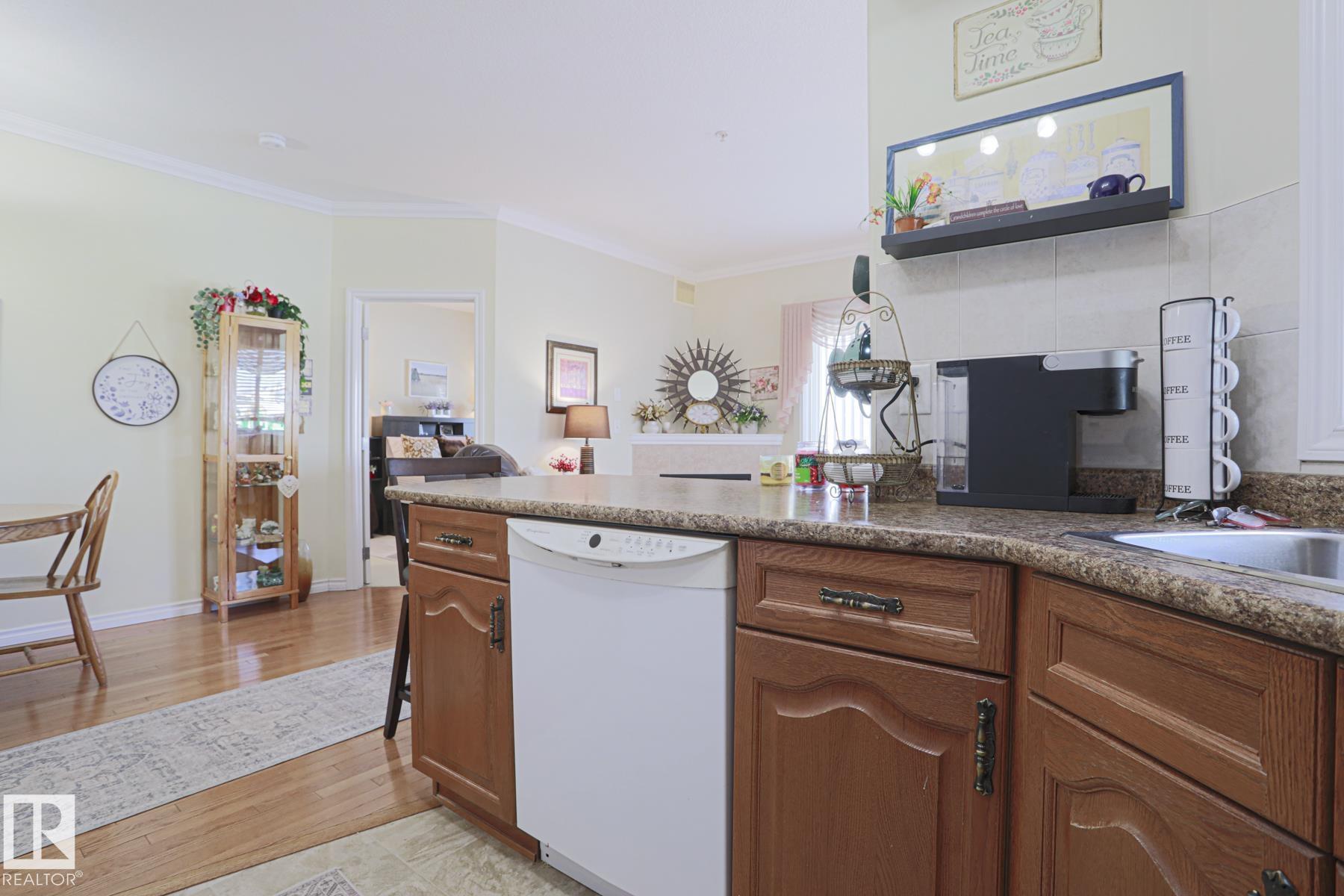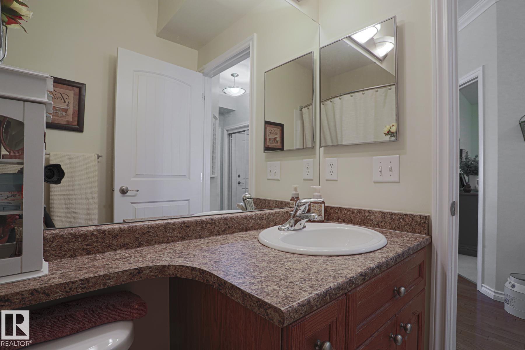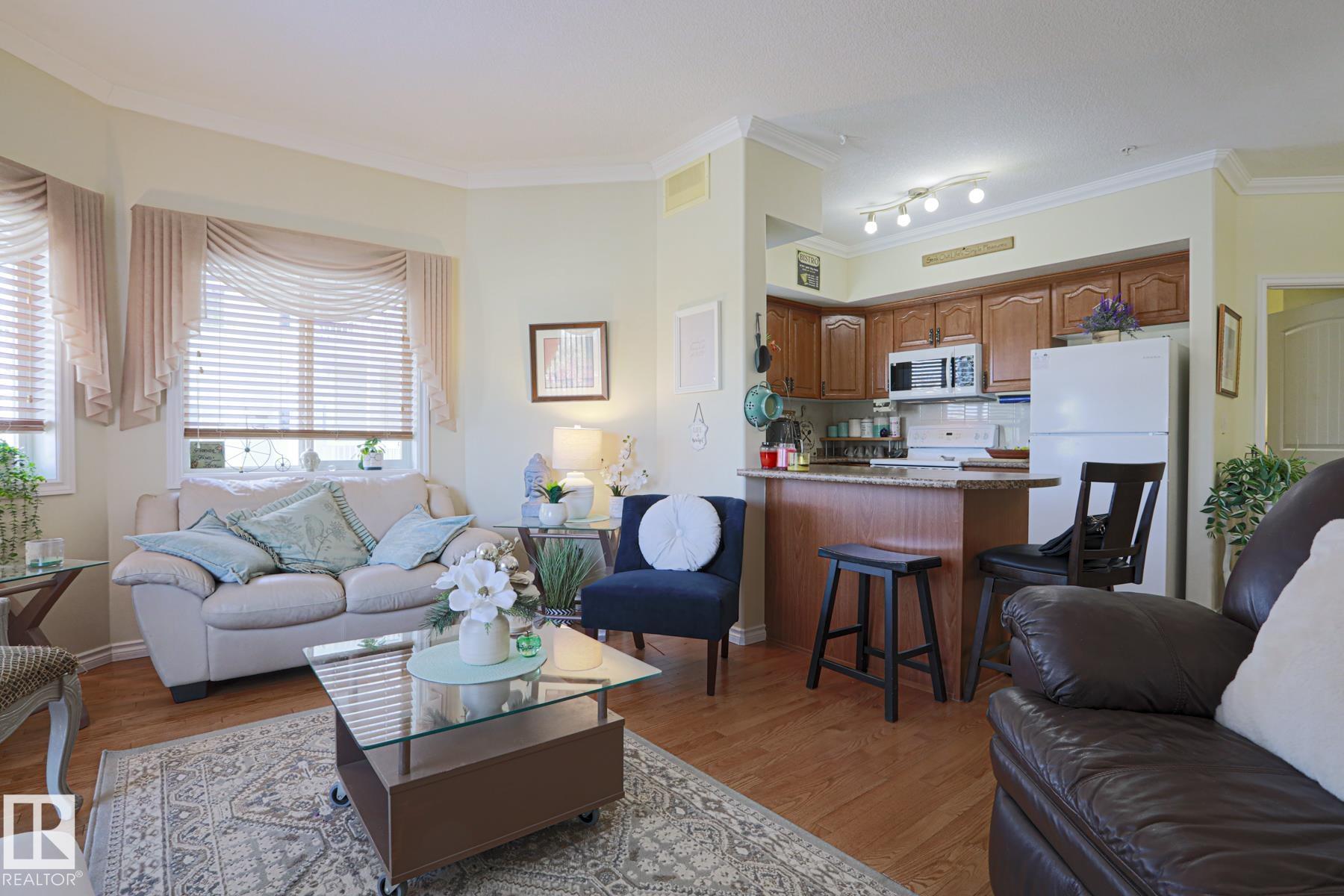 Adult living at its best in Belcanto Court in desirable Bonnie Doon. Beautiful 3rd floor north and east facing suite has lovely primary bedroom, walk through closet and three piece ensuite. Gorgeous hardwood floor adorns the living room with 9' ceilings which features a heartwarming natural gas fireplace with mantle to display your favorite photos and art. Bright kitchen with oak cabinets has a step saving wrap-around style that makes meal prep easy and convenient to serve the breakfast bar and smart dinette. A huge den (which can technically be a bedroom as it has a sprinkler head) makes for a great guest room, office, hobby/craft or relaxing private TV/reading room. You decide! Nice four piece bath for guests with tub. Large laundry room with stacker washer/dryer, lots of shelving and space for your collectibles too. Underground heated parking, carwash, guest suite and social room for savings, value and comfort. Bonnie Doon Mall + Valley Line LRT is close-by for your shopping and travelling convenience.