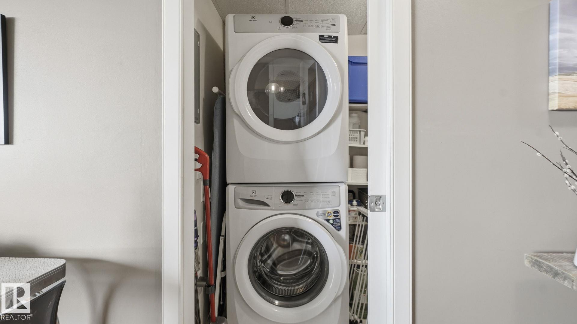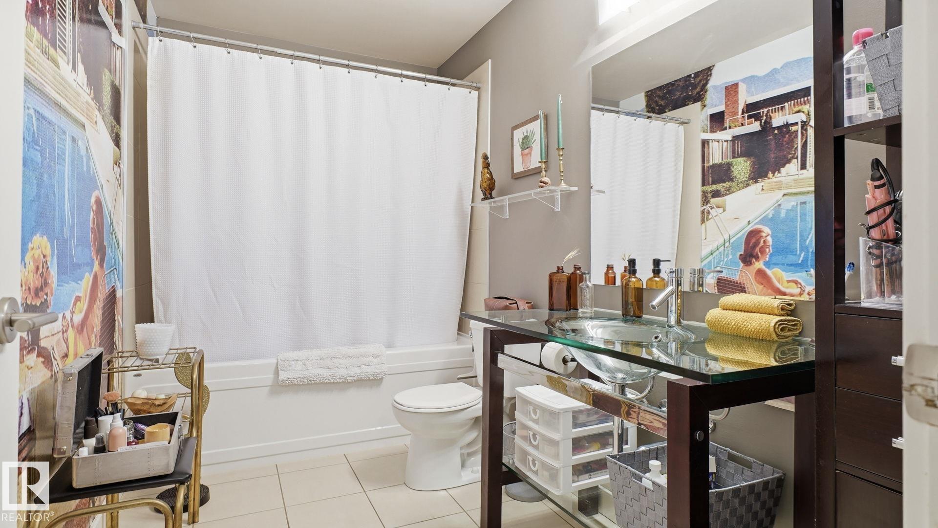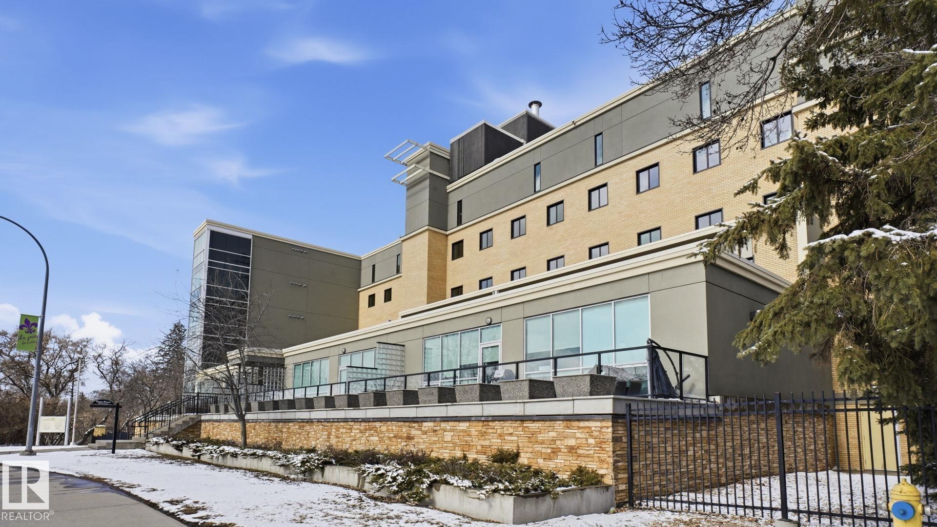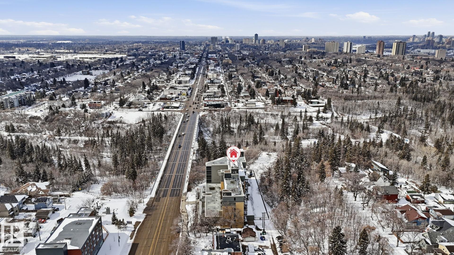 Inviting condo located in Trinity Pointe, a boutique concrete & steel building in Bonnie Doon, steps from Mill Creek Ravine. This bright unit features expansive windows, and a spacious open-concept living area anchored by a cozy gas fireplace. The well-appointed kitchen offers a gas range, built-in oven, dishwasher, and ample cabinetry--perfect for everyday living and entertaining. The spacious corner layout provides excellent natural light and direct access to a private balcony with treed views. The generous primary bedroom includes a walk-in closet and access to a full bath, while in-suite laundry adds everyday ease. Includes 1 underground parking stall and additional storage. Pet friendly building with great amenities featuring a fitness room and secure parkade. Walk to ravine trails, caf‚s, Whyte Ave, and the Valley Line LRT. Ideal for professionals, students, or investors seeking a low-maintenance lifestyle.