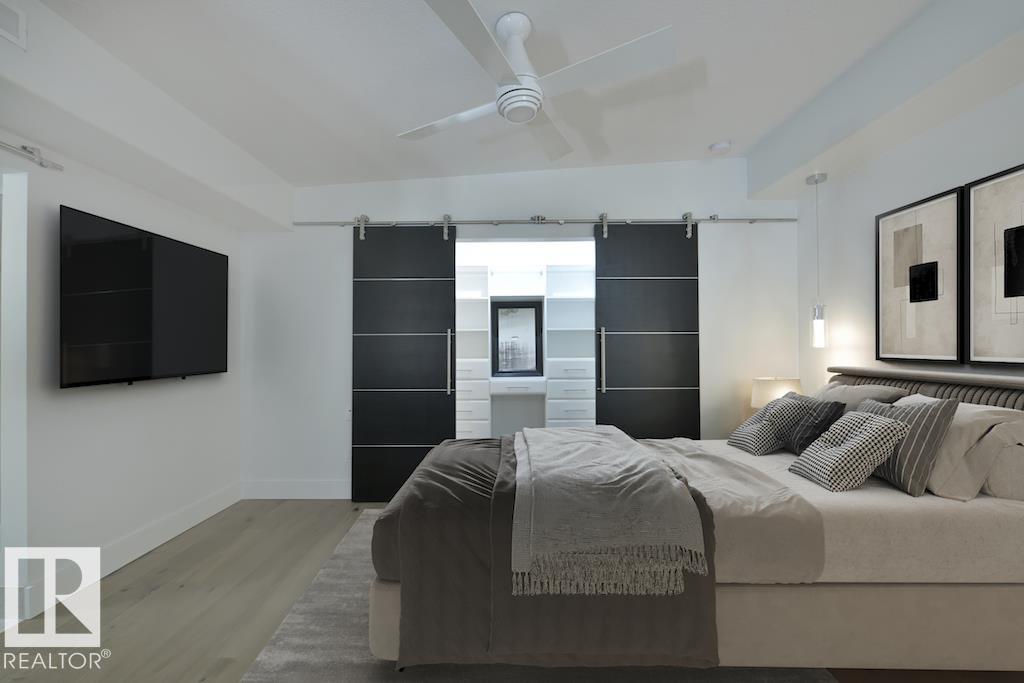 A very rare opportunity to own the PENTHOUSE suite in the sought after Morris Lofts, located in the heart of downtown Edmonton. Like nothing you've seen before, renovated from top to bottom, this home is absolutely spectacular. The bright & airy floor plan is flooding with natural light, hardwood floors, & soaring 24 foot ceilings that will take your breath away upon entry. Every detail of this home is well thought out creating the perfect layout. Offering a large storage room, laundry room, space for an office, pool table or workout space, living & dining space. Kitchen features 8 foot island w/ waterfall quartz countertops, expanding around the exterior allowing for tons of storage & counter space, custom tiled hood fan rising 12 ft, s/s appliances and custom cabinetry. The open glass riser staircase leads you to the luxurious suite with a lrg walk in closet, & tiled en-suite. Enjoy your summer evenings on your covered balcony which offers a view 104th street market & the sunset.
