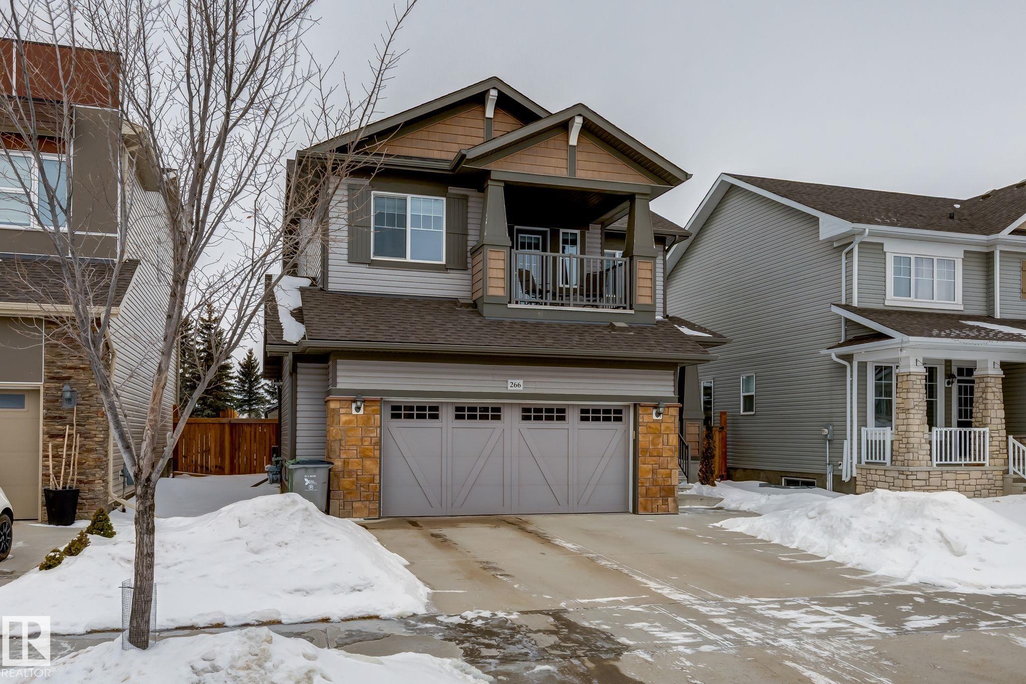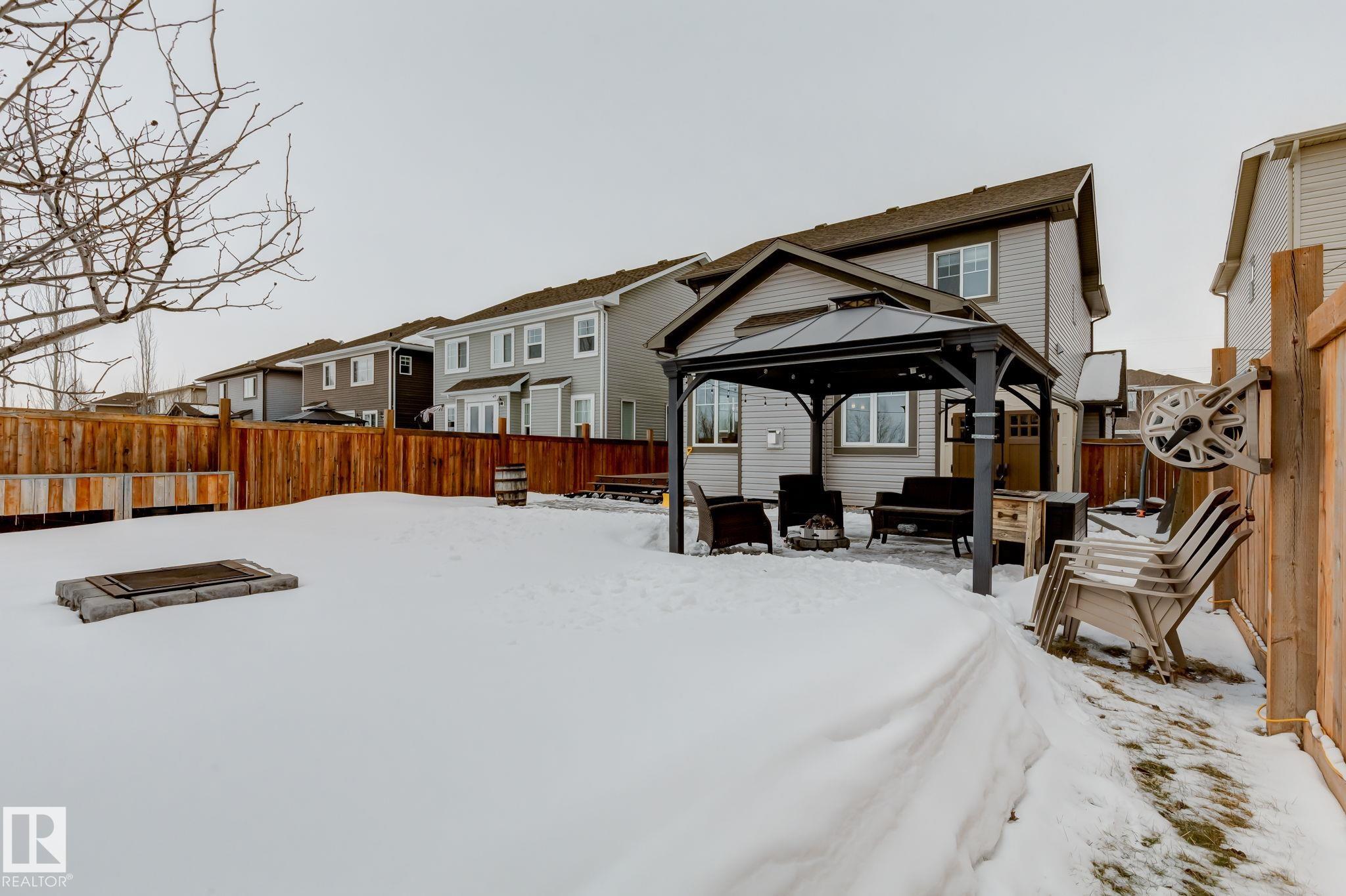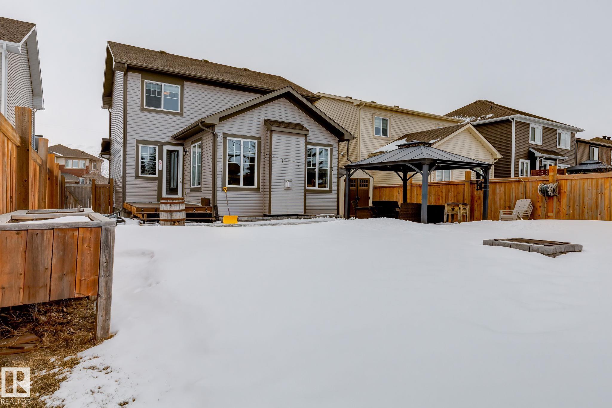 Welcome to this stylish two-storey home with fantastic curb appeal and an extra-wide, heated double garage. The bright, open-concept main floor features a modern kitchen with white uppers, dark lowers, subway tile backsplash, stainless appliances, and a large island with seating. The living room offers a stone-surround fireplace and big windows for natural light, while the dining area opens to the backyard. Upstairs, the primary bedroom includes a large ensuite with double sinks and a custom shower, plus access to an upper patio perfect for morning sun. High-quality window coverings and central A/C add comfort throughout. The unfinished basement offers future potential. The backyard is fully finished with a large tiled area, fire pit, 18ž8 composite deck, 10ž12 gazebo, 8ž8 shed, and beautiful golf-course sunset views. Located in a desirable neighbourhood close to parks and amenities, this move-in-ready home is a must-see.