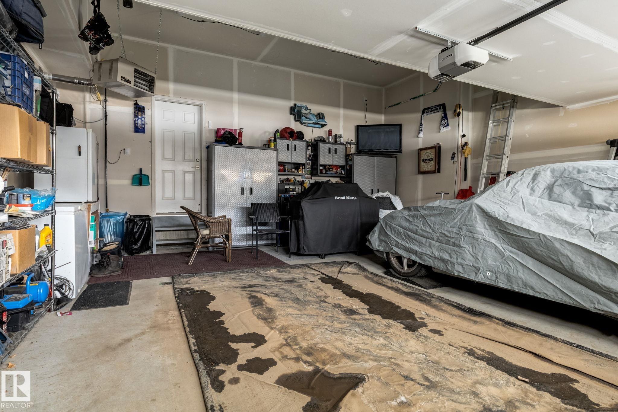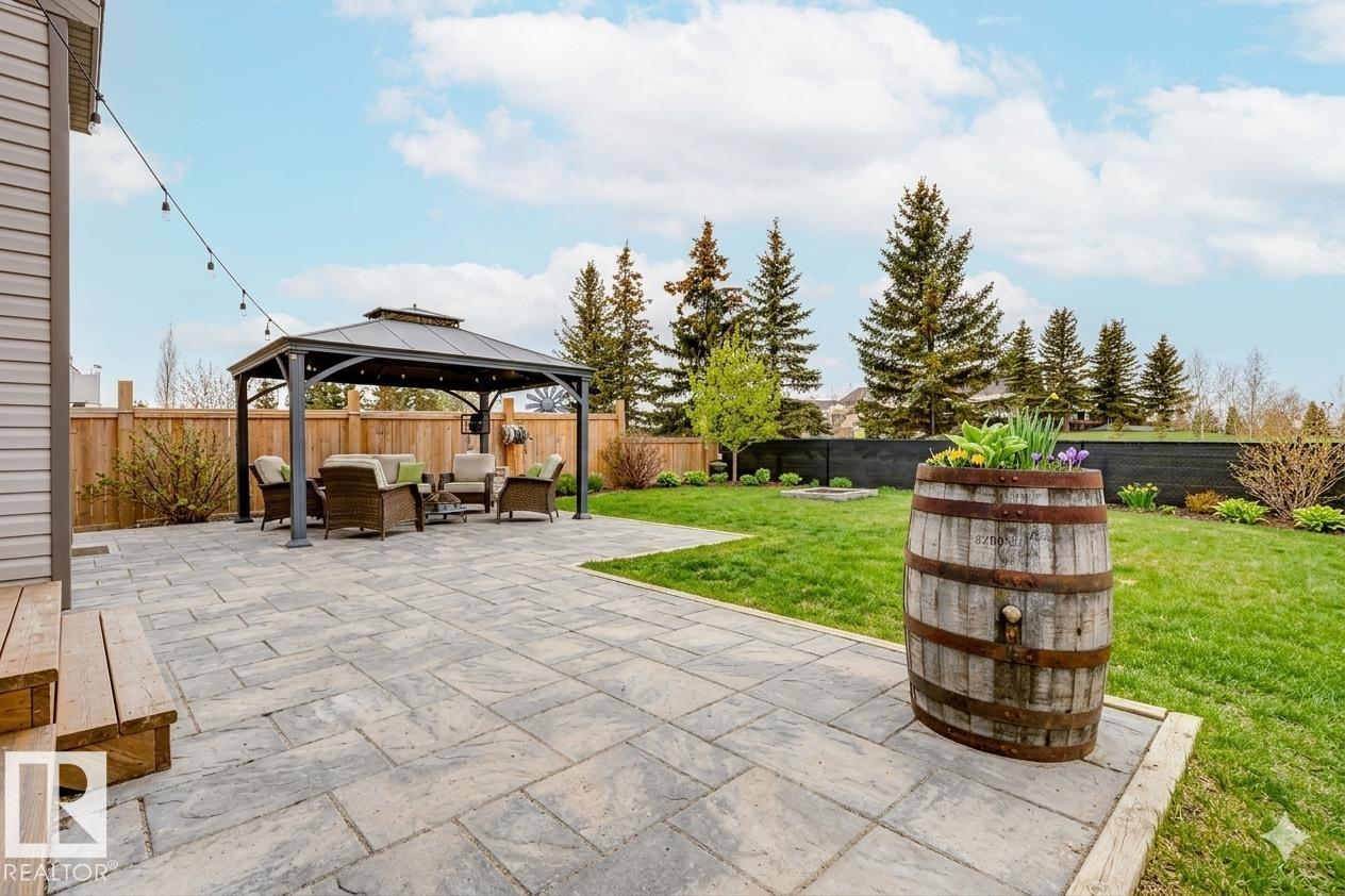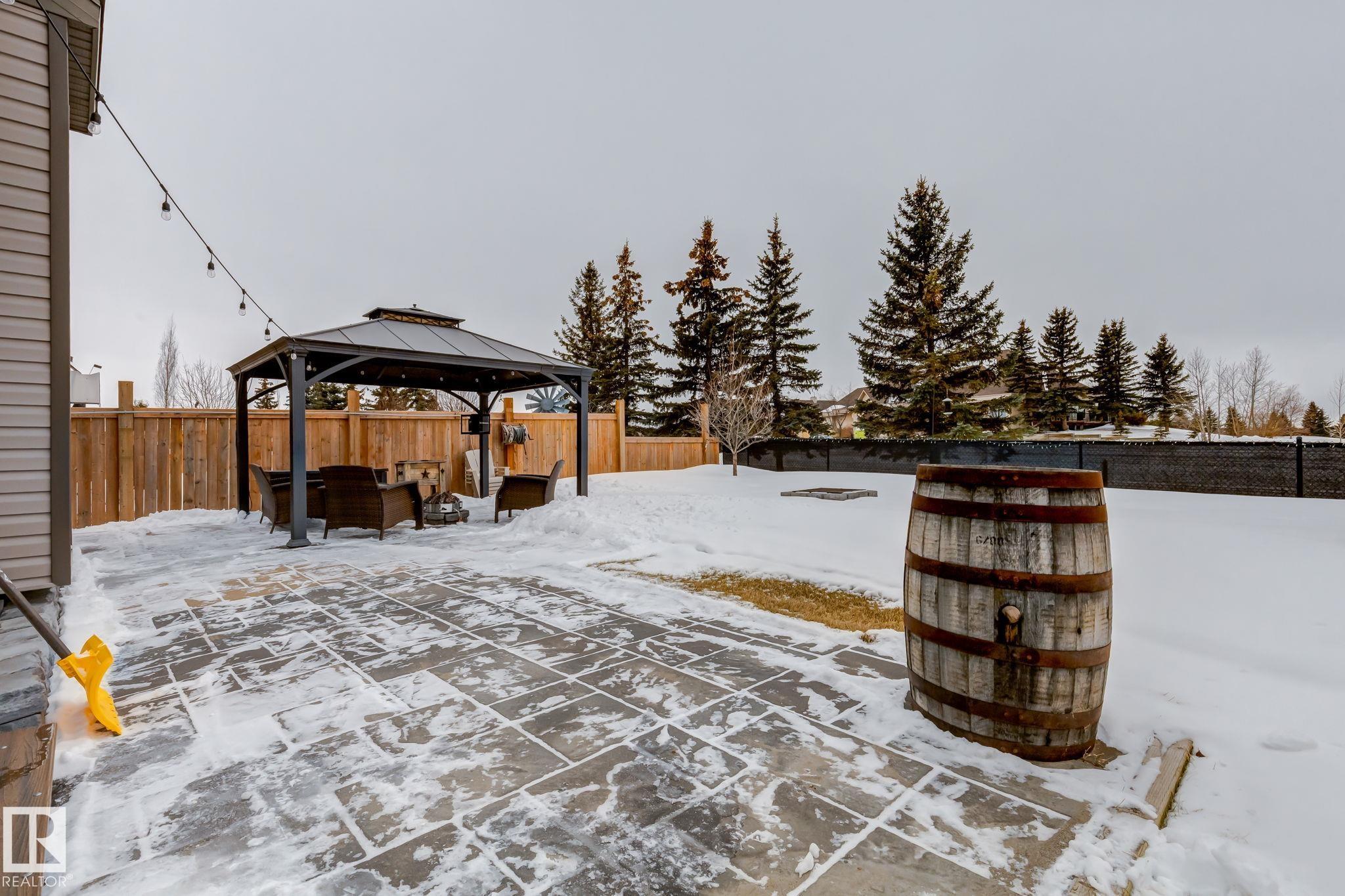 Welcome to this stylish two-storey home with fantastic curb appeal and an extra-wide, heated double garage. The bright, open-concept main floor features a modern kitchen with white uppers, dark lowers, subway tile backsplash, stainless appliances, and a large island with seating. The living room offers a stone-surround fireplace and big windows for natural light, while the dining area opens to the backyard. Upstairs, the primary bedroom includes a large ensuite with double sinks and a custom shower, plus access to an upper patio perfect for morning sun. High-quality window coverings and central A/C add comfort throughout. The unfinished basement offers future potential. The backyard is fully finished with a large tiled area, fire pit, 18ž8 composite deck, 10ž12 gazebo, 8ž8 shed, and beautiful golf-course sunset views. Located in a desirable neighbourhood close to parks and amenities, this move-in-ready home is a must-see.